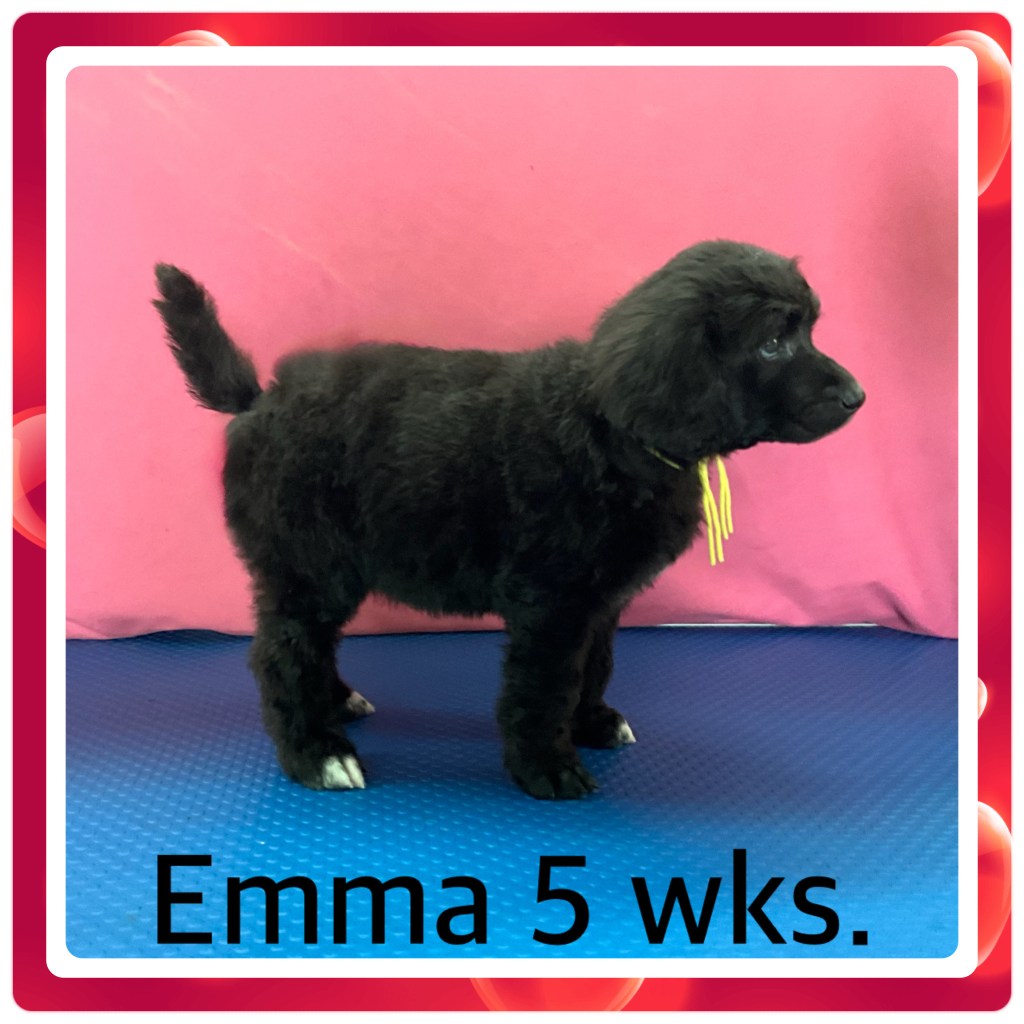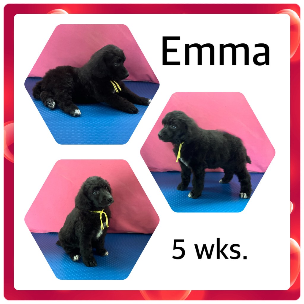 Meet Emma, our adorable 5-week-old female Royal Standard Poodle puppy who is looking for her forever family! Emma is a beautiful black puppy with three charming white-tipped toes and one solid black front toe — a truly unique and striking girl. She is friendly, intelligent, and already showing her sweet, social personality. If you’re looking for a loving, well-socialized Royal Standard Poodle to join your family, Emma may be the perfect match!