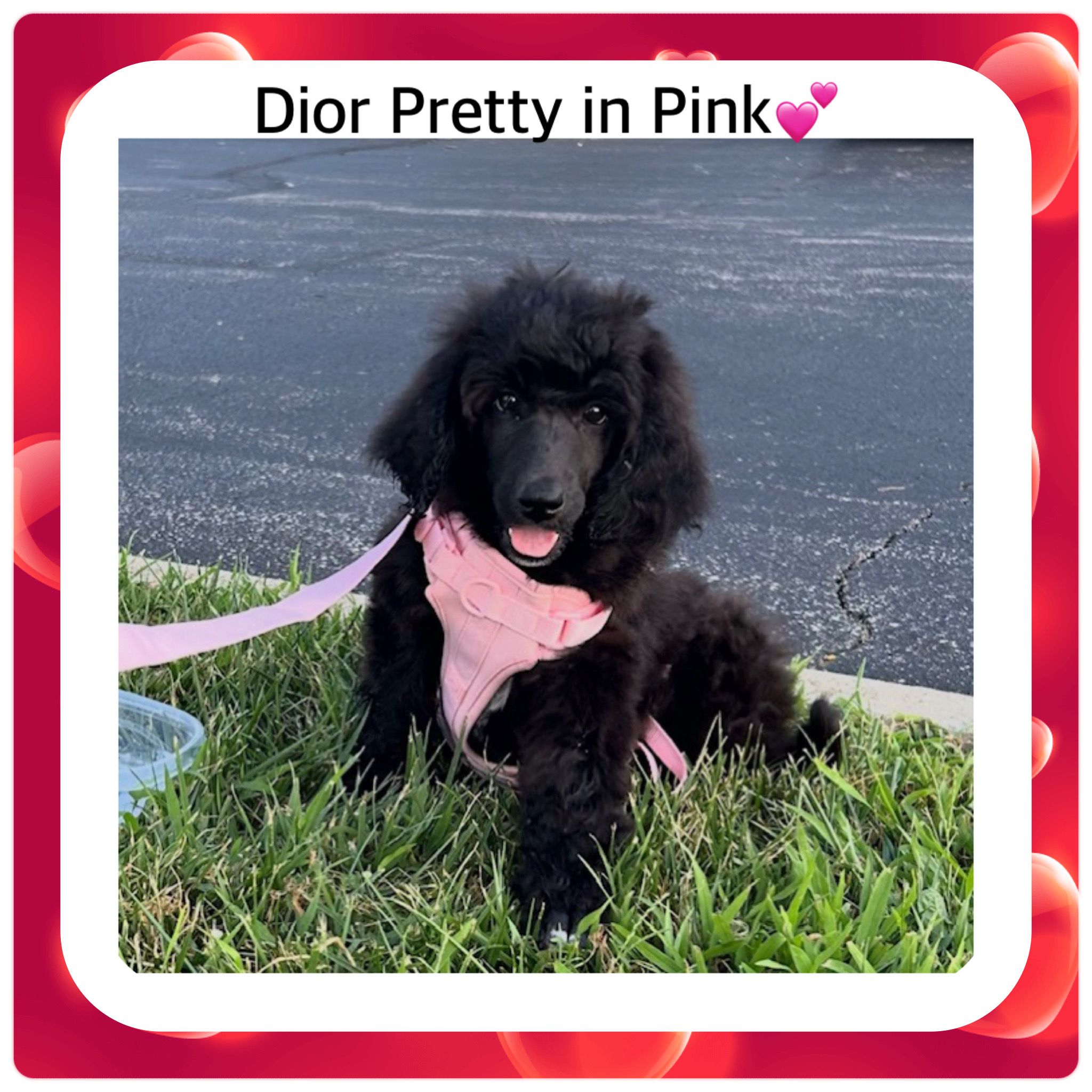 “Pretty in pink 💕 Dior, our sweet Royal Standard Poodle puppy, mastering her first steps on the lead like a little pro!”