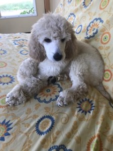 Lola just came from the vet, everything is just fine . The vet kept commenting on how big she was. He said he has seen tall standards but they are fine boned with long skinny bodies and legs. He feels she is going to be an exceptionally big solid girl. She weighed 19 pounds, maybe a pinch more. I had a hard time keeping her on the scale once she spotted the other dogs. She is still doing wonderful and has a strong bond with the boys. I will send pictures in a few weeks so you can see how much she is changing.