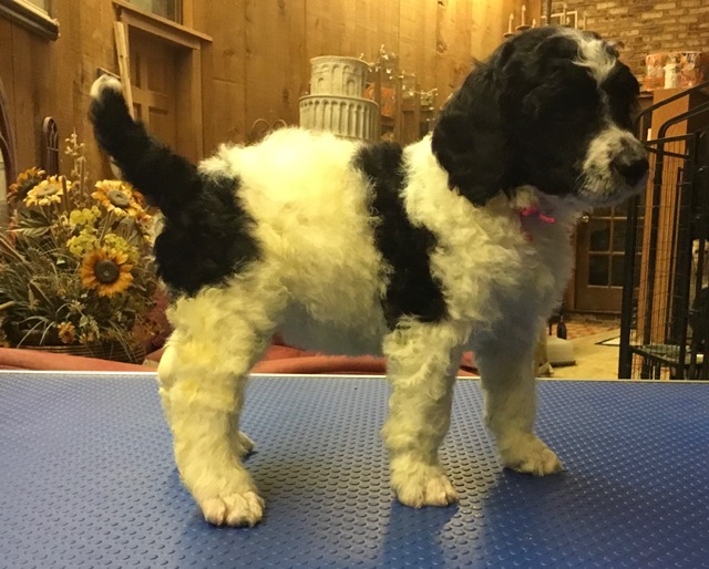 Flash is our Royal Parti Poodle who is Black and White. Flash is 27 in. at the withers and weighs 75lbs.