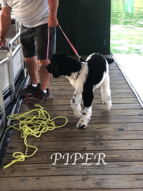 PIPER ENJOYING BEING FIRST MATE ON HER VACATION. PIPER ENJOYS THE WATER , SWIMMING, AND BOATING. SHE ESPECIALLY ENJOYS SWIMMING WITH HER SISTER.