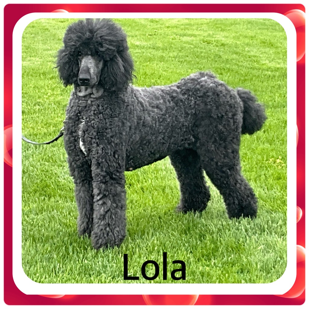 Lola is our stunning black female Royal Standard Poodle who will be turning 7 years old in June, and as we retire from breeding, she is ready to find a loving forever home of her own. She stands approximately 27 inches at the withers and weighs between 80–85 pounds, with a striking presence softened by a small patch of white on her chest and her three middle back toes. Lola is a mature, intelligent, and devoted companion who thrives in a calm, attentive environment. She has a gentle, loyal nature and would do wonderfully in a home where she can be cherished as a beloved family member and enjoy the comfort and companionship she deserves in this next stage of her life. There will be an adoption fee for Lola.