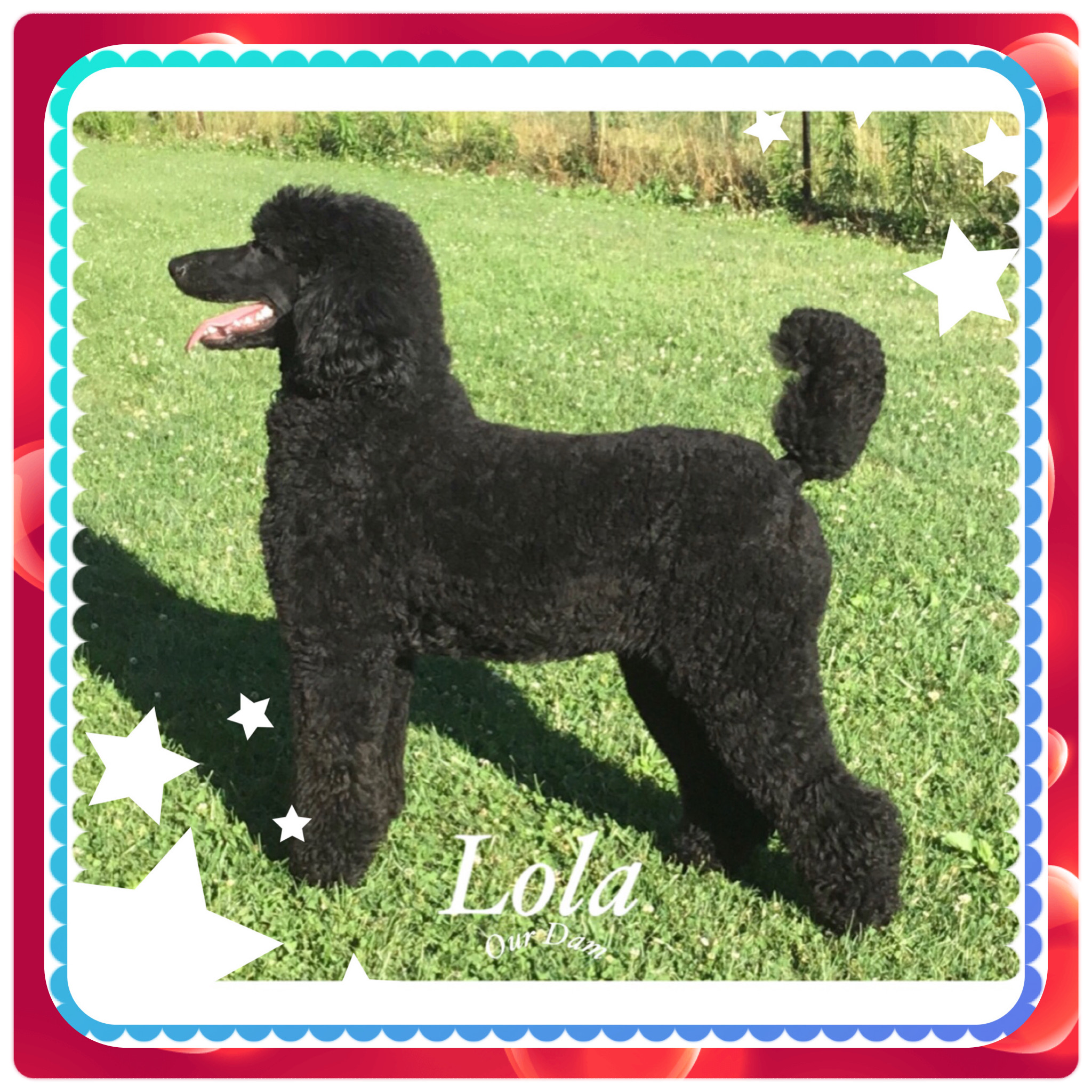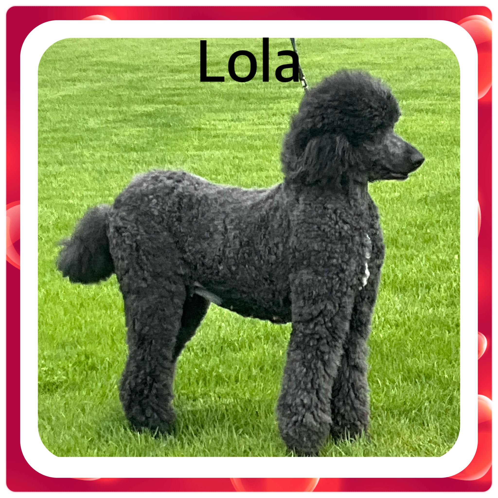 Lola is our stunning black female Royal Standard Poodle who will be turning 7 years old in June, and as we retire from breeding, she is ready to find a loving forever home of her own. She stands approximately 27 inches at the withers and weighs between 80–85 pounds, with a striking presence softened by a small patch of white on her chest and her three middle back toes. Lola is a mature, intelligent, and devoted companion who thrives in a calm, attentive environment. She has a gentle, loyal nature and would do wonderfully in a home where she can be cherished as a beloved family member and enjoy the comfort and companionship she deserves in this next stage of her life. There will be an adoption fee for Lola.